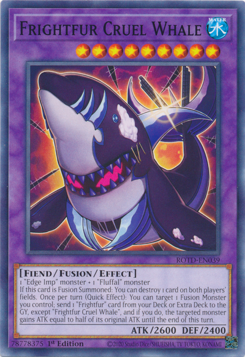 1 "Edge Imp" monster + 1 "Fluffal" monster If this card is Fusion Summoned: You can destroy 1 card on both players' fields. Once per turn (Quick Effect): You can target 1 Fusion Monster you control; send 1 "Frightfur" card from your Deck or Extra Deck to the GY, except "Frightfur Cruel Whale", and if you do, the targeted monster gains ATK equal to half of its original ATK until the end of this turn.