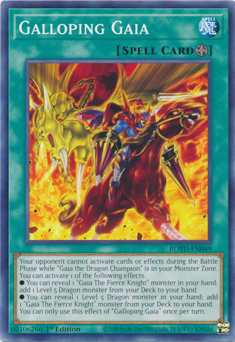 Your opponent cannot activate cards or effects during the Battle Phase while "Gaia the Dragon Champion" is in your Monster Zone. You can activate 1 of the following effects. • You can reveal 1 "Gaia The Fierce Knight" monster in your hand; add 1 Level 5 Dragon monster from your Deck to your hand. • You can reveal 1 Level 5 Dragon monster in your hand; add 1 "Gaia The Fierce Knight" monster from your Deck to your hand. You can only use this effect of "Galloping Gaia" once per turn.