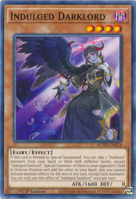 If this card is Normal or Special Summoned: You can take 2 "Darklord" monsters from your hand or Deck with different Levels, except "Indulged Darklord", Special Summon 1 of them to your opponent's field in Defense Position and add the other to your hand, also you cannot activate monster effects for the rest of this turn, except Fairy monsters. You can only use this effect of "Indulged Darklord" once per turn.
