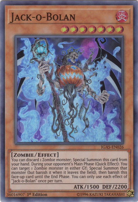 You can discard 1 Zombie monster; Special Summon this card from your hand. During your opponent's Main Phase (Quick Effect): You can target 1 Zombie monster in either GY; Special Summon that monster (but banish it when it leaves the field), then banish this face-up card until the End Phase. You can only use each effect of "Jack-o-Bolan" once per turn.