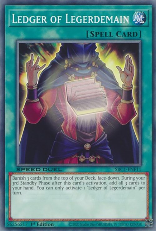 Banish 3 cards from the top of your Deck, face-down; during your 3rd Standby Phase after this card's activation, add those 3 banished cards to your hand. You can only activate 1 "Ledger of Legerdemain" per turn.