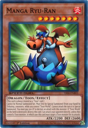 (This card is always treated as a "Toon" card.) Cannot be Normal Summoned/Set. Must first be Special Summoned (from your hand) by Tributing 2 monsters, while you control "Toon World". Cannot attack the turn it is Special Summoned. You must pay 500 Life Points to declare an attack with this monster. If "Toon World" on the field is destroyed, destroy this card. Can attack your opponent directly, unless they control a Toon Monster, in which case this card must target a Toon Monster for its attacks.