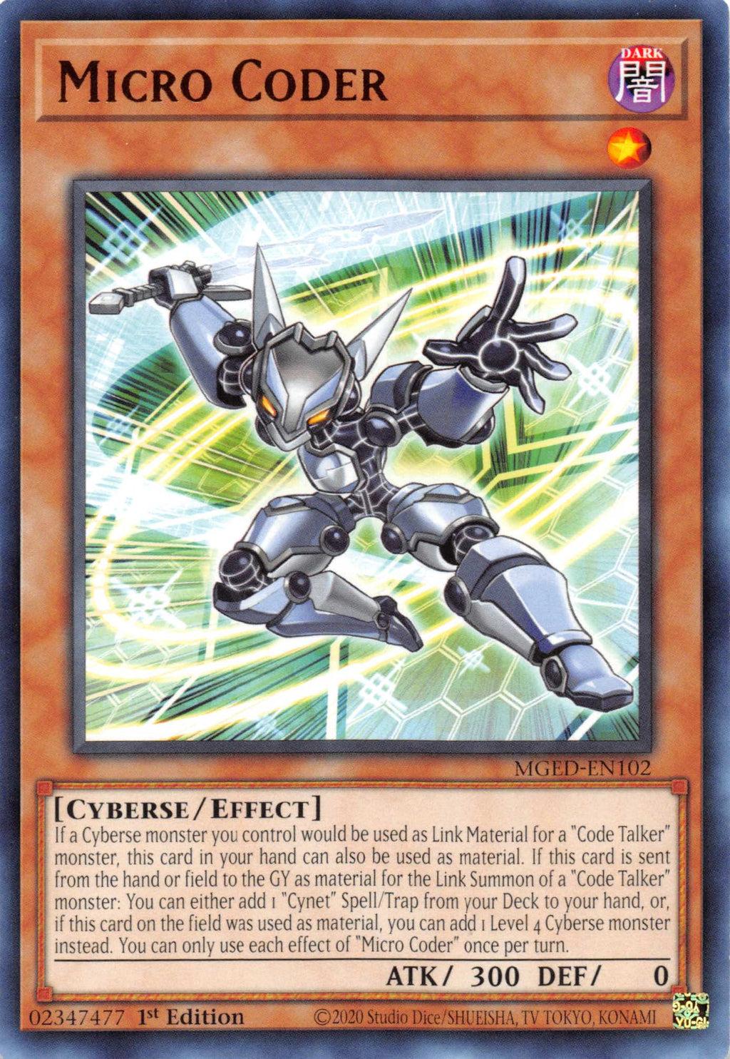 If a Cyberse monster you control would be used as Link Material for a "Code Talker" monster, this card in your hand can also be used as material. If this card is sent from the hand or field to the GY as material for the Link Summon of a "Code Talker" monster: You can either add 1 "Cynet" Spell/Trap from your Deck to your hand, or, if this card on the field was used as material, you can add 1 Level 4 Cyberse monster instead. You can only use each effect of "Micro Coder" once per turn.