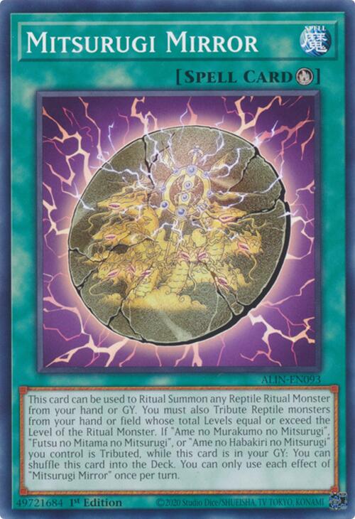 This card can be used to Ritual Summon any Reptile Ritual Monster from your hand or GY. You must also Tribute Reptile monsters from your hand or field whose total Levels equal or exceed the Level of the Ritual Monster. If "Ame no Murakumo no Mitsurugi", "Futsu no Mitama no Mitsurugi", or "Ame no Habakiri no Mitsurugi" you control is Tributed, while this card is in your GY: You can shuffle this card into the Deck. You can only use each effect of "Mitsurugi Mirror" once per turn.