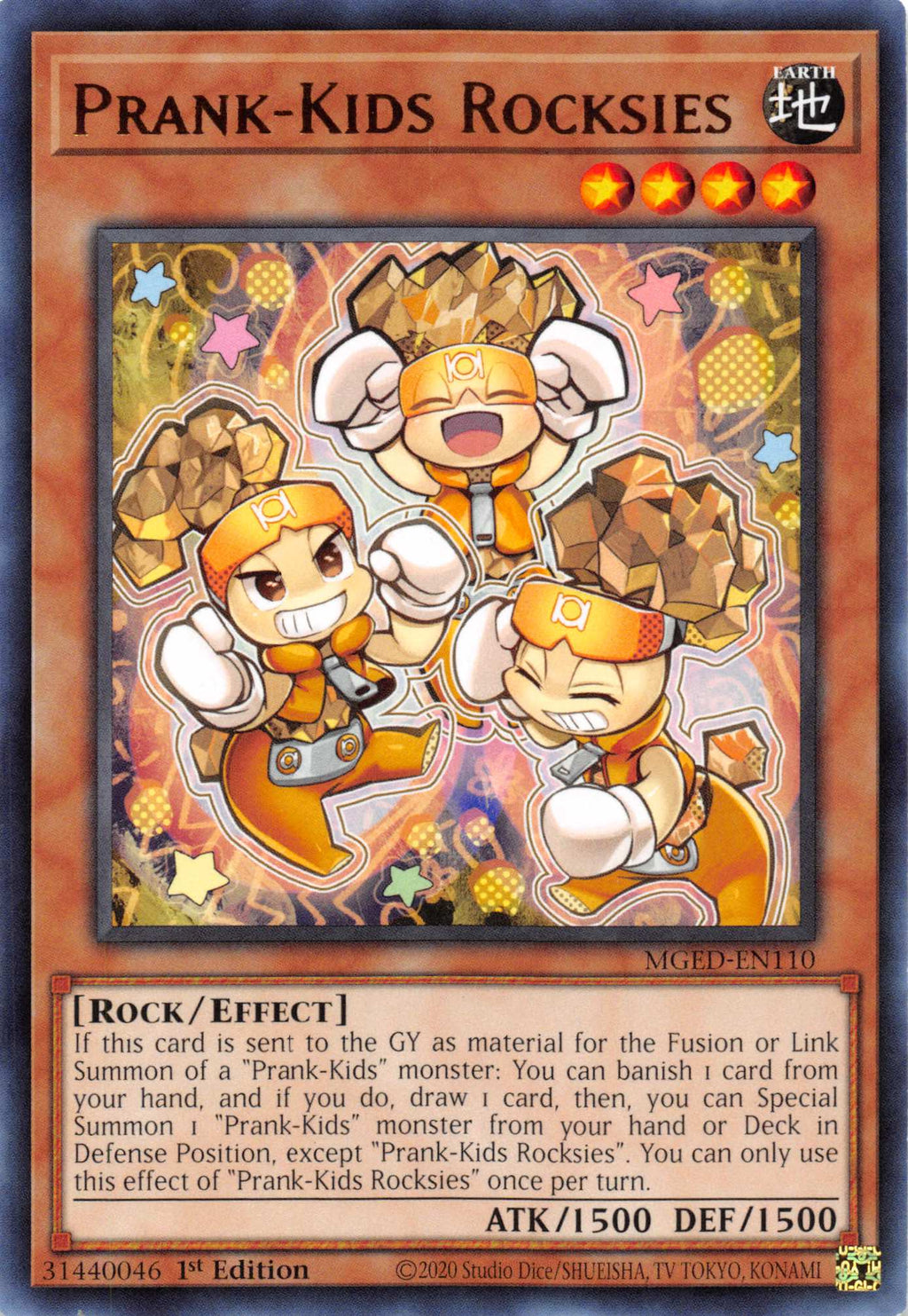 If this card is sent to the GY as material for the Fusion or Link Summon of a "Prank-Kids" monster: You can banish 1 card from your hand, and if you do, draw 1 card, then, you can Special Summon 1 "Prank-Kids" monster from your hand or Deck in Defense Position, except "Prank-Kids Rocksies". You can only use this effect of "Prank-Kids Rocksies" once per turn.