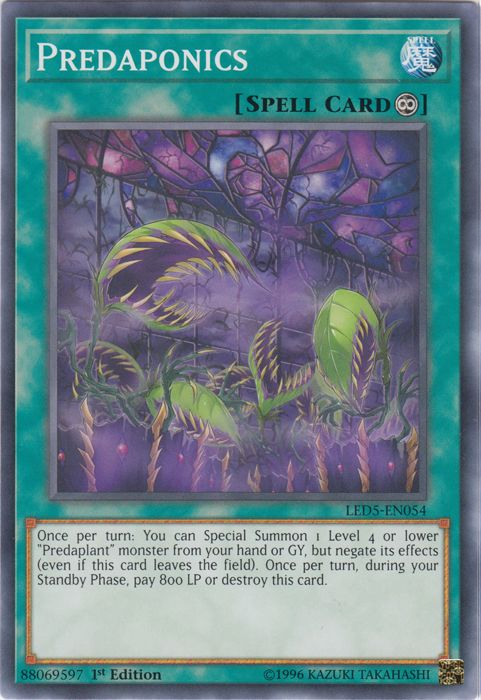 Once per turn: You can Special Summon 1 Level 4 or lower "Predaplant" monster from your hand or Graveyard, but it has its effects negated (even if this card leaves the field). Once per turn, during your Standby Phase, pay 800 LP or destroy this card.