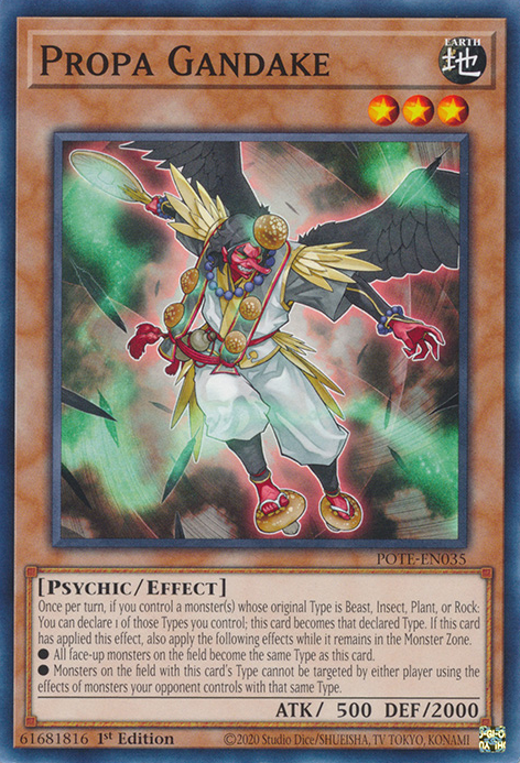 Once per turn, if you control a monster(s) whose original Type is Beast, Insect, Plant, or Rock: You can declare 1 of those Types you control; this card becomes that declared Type. If this card has applied this effect, also apply the following effects while it remains in the Monster Zone. • All face-up monsters on the field become the same Type as this card. • Monsters on the field with this card's Type cannot be targeted by either player using the effects of monsters your opponent controls with that same Type.