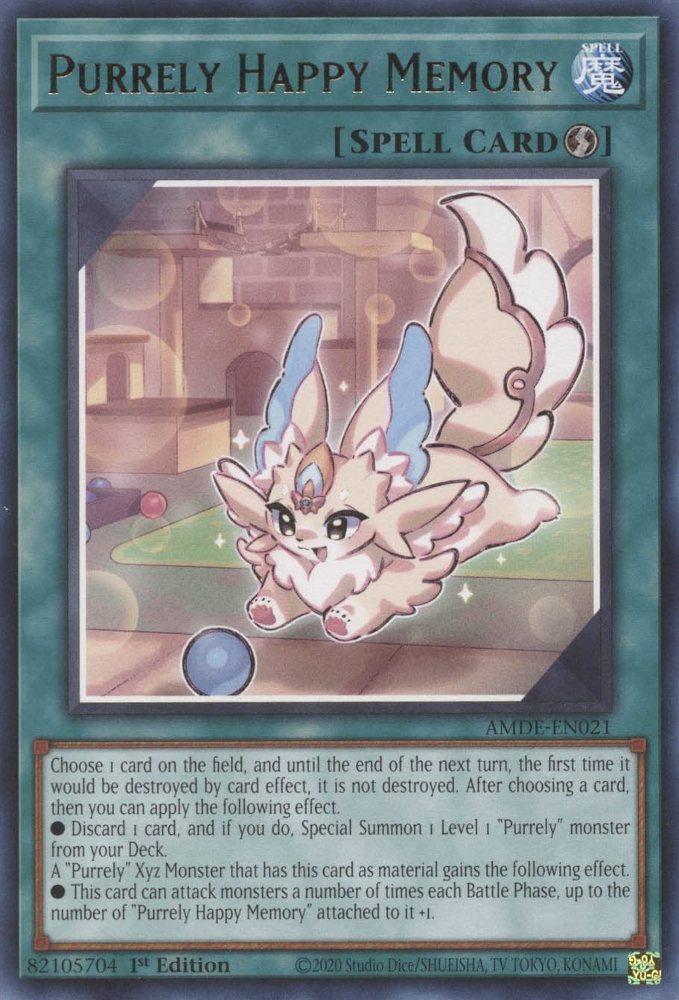 Choose 1 card on the field, and until the end of the next turn, the first time it would be destroyed by card effect, it is not destroyed. After choosing a card, then you can apply the following effect. • Discard 1 card, and if you do, Special Summon 1 Level 1 "Purrely" monster from your Deck. A "Purrely" Xyz Monster that has this card as material gains the following effect. • This card can attack monsters a number of times each Battle Phase, up to the number of "Purrely Happy Memory" attached to it +1.