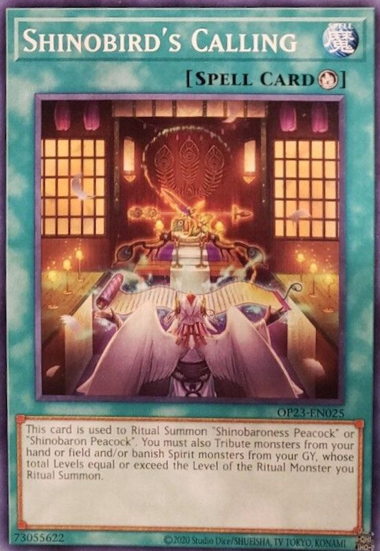 This card is used to Ritual Summon "Shinobaroness Peacock" or "Shinobaron Peacock". You must also Tribute monsters from your hand or field and/or banish Spirit monsters from your Graveyard, whose total Levels equal or exceed the Level of the Ritual Monster you Ritual Summon. Official Tournament Stores must review their Konami OTS agreement before selling this product.