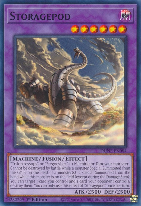 "Trifortressops" or "Stegocyber" + 1 Machine or Dinosaur monster Cannot be destroyed by battle while a monster Special Summoned from the GY is on the field. If a monster(s) is Special Summoned from the hand while this monster is on the field (except during the Damage Step): You can target 1 card you control and 1 card your opponent controls; destroy them. You can only use this effect of "Storagepod" once per turn.
