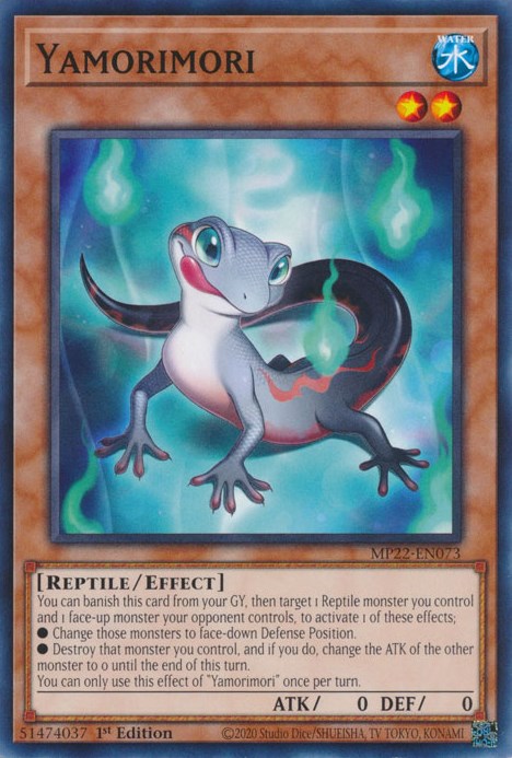You can banish this card from your GY, then target 1 Reptile monster you control and 1 face-up monster your opponent controls, to activate 1 of these effects; • Change those monsters to face-down Defense Position. • Destroy that monster you control, and if you do, change the ATK of the other monster to 0 until the end of this turn. You can only use this effect of "Yamorimori" once per turn.