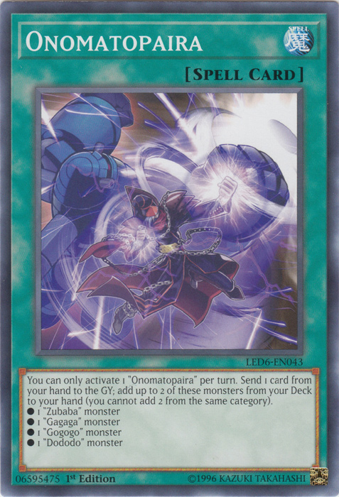 You can only activate 1 "Onomatopaira" per turn. Send 1 card from your hand to the Graveyard; add up to 2 of these monsters from your Deck to your hand (you cannot add 2 from the same category). • 1 "Zubaba" monster • 1 "Gagaga" monster • 1 "Gogogo" monster • 1 "Dododo" monster