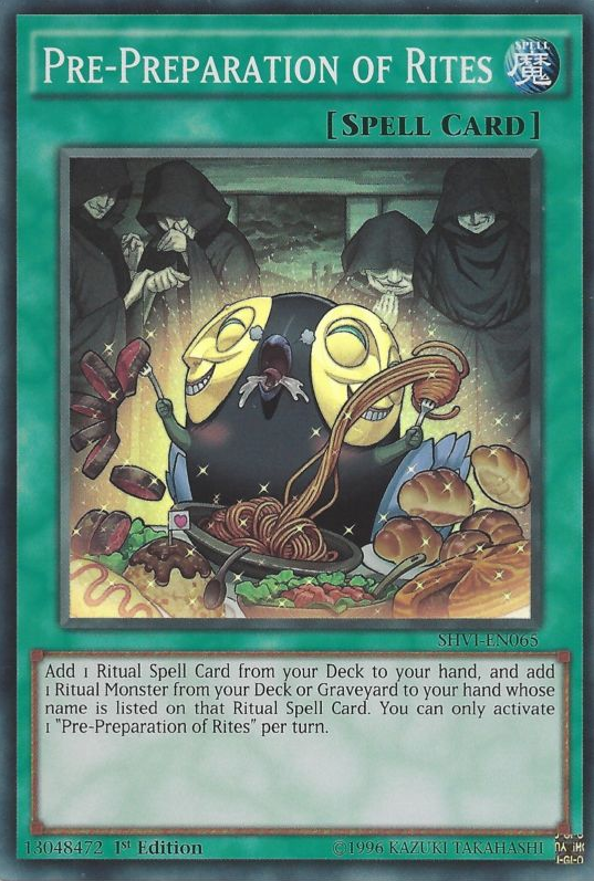 Add 1 Ritual Spell Card from your Deck to your hand, and add 1 Ritual Monster from your Deck or Graveyard to your hand whose name is listed on that Ritual Spell Card. You can only activate 1 "Pre-Preparation of Rites" per turn.