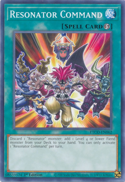 Discard 1 "Resonator" monster; add 1 Level 4 or lower Fiend monster from your Deck to your hand. You can only activate 1 "Resonator Command" per turn.