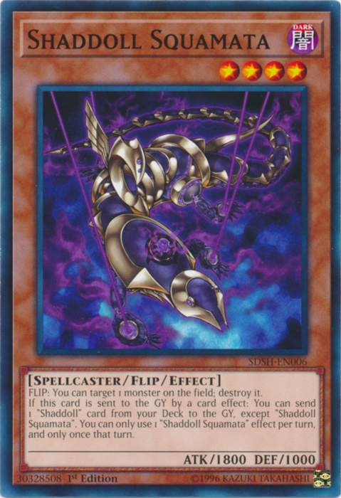 FLIP: You can target 1 monster on the field; destroy it. If this card is sent to the GY by a card effect: You can send 1 "Shaddoll" card from your Deck to the GY, except "Shaddoll Squamata". You can only use 1 "Shaddoll Squamata" effect per turn, and only once that turn.