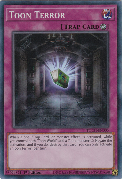 When a Spell/Trap Card, or monster effect, is activated, while you control both "Toon World" and a Toon monster(s): Negate the activation, and if you do, destroy that card. You can only activate 1 "Toon Terror" per turn.