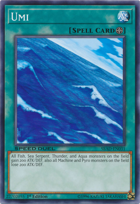 All Fish, Sea Serpent, Thunder, and Aqua monsters on the field gain 200 ATK/DEF, also all Machine and Pyro monsters on the field lose 200 ATK/DEF.