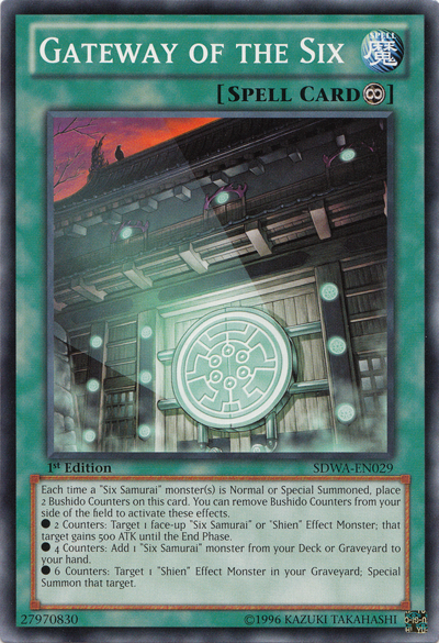 Each time a "Six Samurai" monster(s) is Normal or Special Summoned, place 2 Bushido Counters on this card. You can remove Bushido Counters from your side of the field to activate these effects. ● 2 Counters: Target 1 face-up "Six Samurai" or "Shien" Effect Monster; that target gains 500 ATK until the End Phase. ● 4 Counters: Add 1 "Six Samurai" monster from your Deck or Graveyard to your hand. ● 6 Counters: Target 1 "Shien" Effect Monster in your Graveyard; Special Summon that target.