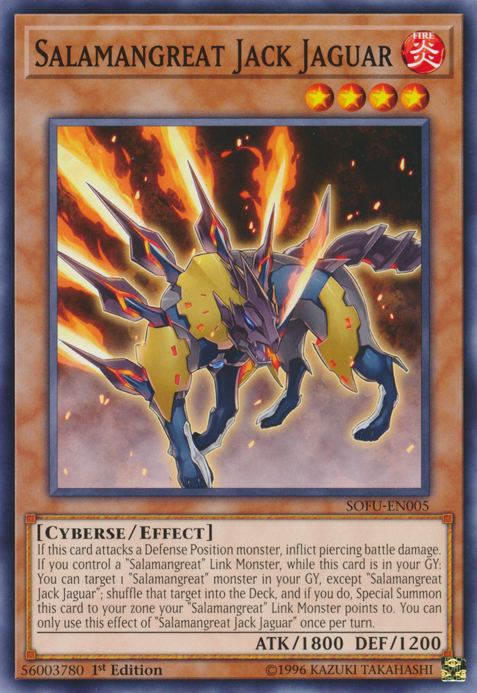 If this card attacks a Defense Position monster, inflict piercing battle damage. If this card is in your GY and you control a “Salamangreat” Link Monster: You can target 1 “Salamangreat” monster in your GY, except “Salamangreat Jack Jaguar”; shuffle it into the Deck, and if you do, Special Summon this card to your zone a “Salamangreat” Link Monster you control points to. You can only use this effect of "Salamangreat Jack Jaguar" once per turn.
